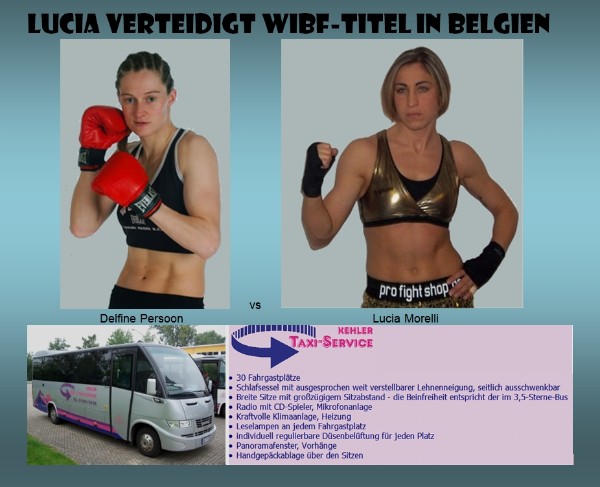 News  ___ 23.01.2012 ___________________________________________________________________________________________________________________ Die Vorbereitungen laufen auf Hochtouren. Am 25.02.2012 wird Lucia ihren WIBF Leichtgewichts-Titel in Belgien gegen die Belgierin Delfine Persoon verteidigen. Zur Unterstützung habe ich einen 30er Reisebus mit Schlafsessel bestellt. Wir fahren am 25.02.2012 ca. 12 h in Offenburg ab und werden nach dem Kampf wieder zurückfahren. Fahrstrecke ca. 570 km. Die Kosten liegen bei 45 € ( 25 € Eintritt + 20 € Bus). Es sind noch wenige Plätze frei. Wer Interesse hat, meldet sich bitte per Mail an andy@lucia-morelli.org  _____________________________________________________________________________________________________________________________________