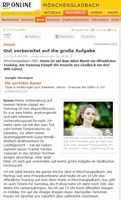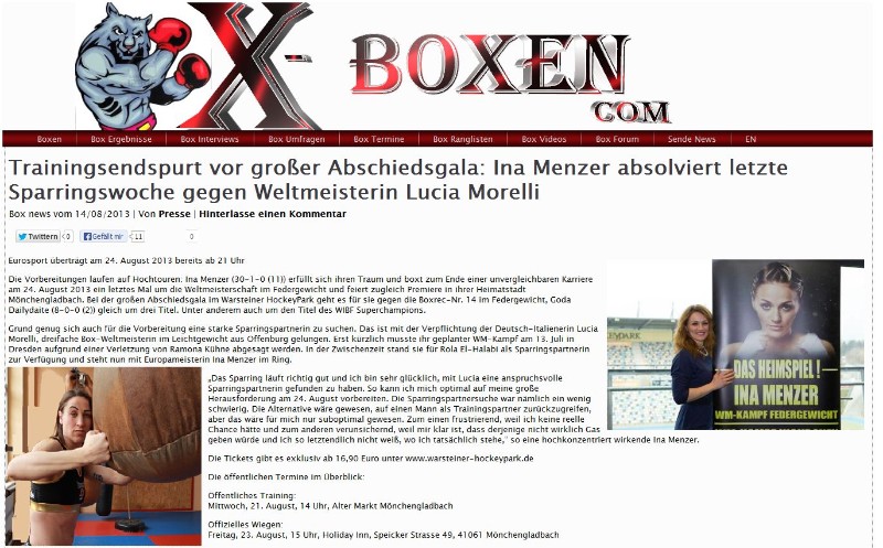 Ina Menzer wird am 24.08.2013 in ihrer Heimatstadt, Mönchengladbach ihren Abschiedskampf bestreiten.
